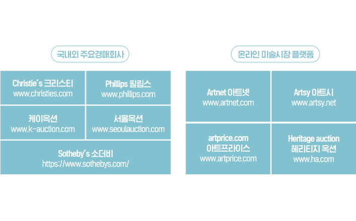 미술품컬렉션에 성공하려면 미술품을 구입하는 것만큼 중요한 것이 지속적으로 미술시장에 대한 정보를 얻고 예술가의 작품들을 보다 많이 보는 것입니다. 아트허브, 달진닷컴과 같은 미술정보 사이트를 방문하면 국내 갤러리와 미술관 전시정보를 얻을 수 있을 뿐만 아니라 매일 발행되는 미술시장 관련 기사들을 모두 살펴볼 수 있습니다. 해외 미술시장의 동향에 대해서 알고 싶다면, 앞서 온라인 미술시장 플랫폼으로 소개했던 아트시(Artsy)나 아트넷(Artnet), 아트프라이스(Artprice)에서 발행하는 기사나 리포트를 살펴보는 것이 도움이 됩니다.