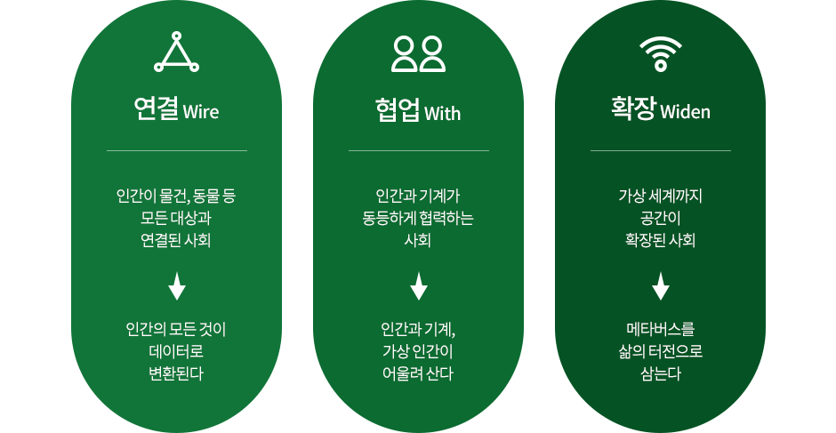 우리는 이미 AI 기술을 기반으로 만들어진 가상 인간이 출연하는 광고를 TV를 통해 만나고 있으며, 많은 SNS 팔로워를 보유한 가상 인간도 어렵지 않게 찾아볼 수 있는 사회에 살고 있다. 그리고 이들은 자영업자를 도와 손님의 예약 전화를 대신 받아주고, 돌봄과 관심이 필요한 독거노인을 위해 안부 전화를 걸어주는 사회복지사 역할까지 대체하고 있다. 게다가 AI 기술은 우리가 살고 있는 사회적 공간을 확장하고 있다. 예를 들어, AI 소사이어티의 시민들은 메타버스 공간으로 출근하고 새로운 친구를 만들기 시작했다. 메타버스라는 가상공간으로 확장된 사회에서 AI의 역할은 더 중요해질 것이다. 새로운 사회적 공간에서 AI는 10년 전 영화에서 보던 사람 말을 곧잘 이해하고 소통하던 로봇이나 운영체제의 모습이 아니다. 인공지능에 대한 이질감은 기술의 발전으로 인해 계속해서 줄어들고 있으며, 이제 우리는 이들과 더 깊이 연결(wired)되고 협업(with)하는 확장(widen)된 사회에 살게 되었다.