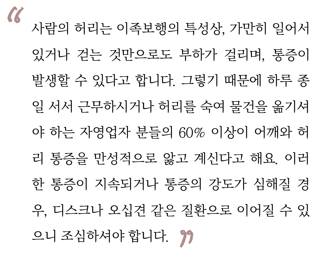 그렇기 때문에 하루 종일 서서 근무하시거나 허리를 숙여 물건을 옮기셔야 하는 자영업자 분들의 60% 이상이 어깨와 허리 통증을 만성적으로 앓고 계신다고 해요.