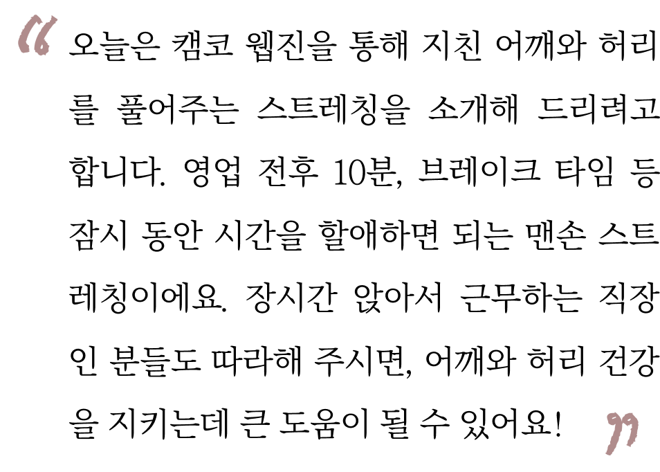 영업 전후 10분, 브레이크 타임 등 잠시 동안 시간을 할애하면 되는 맨손 스트레칭이에요.