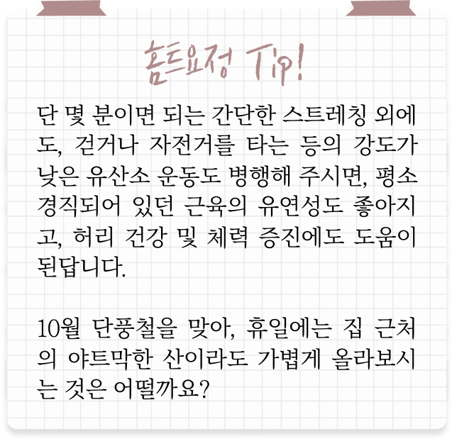 장시간 앉아서 근무하는 직장인 분들도 따라해 주시면, 어깨와 허리 건강을 지키는데 큰 도움이 될 수 있어요!