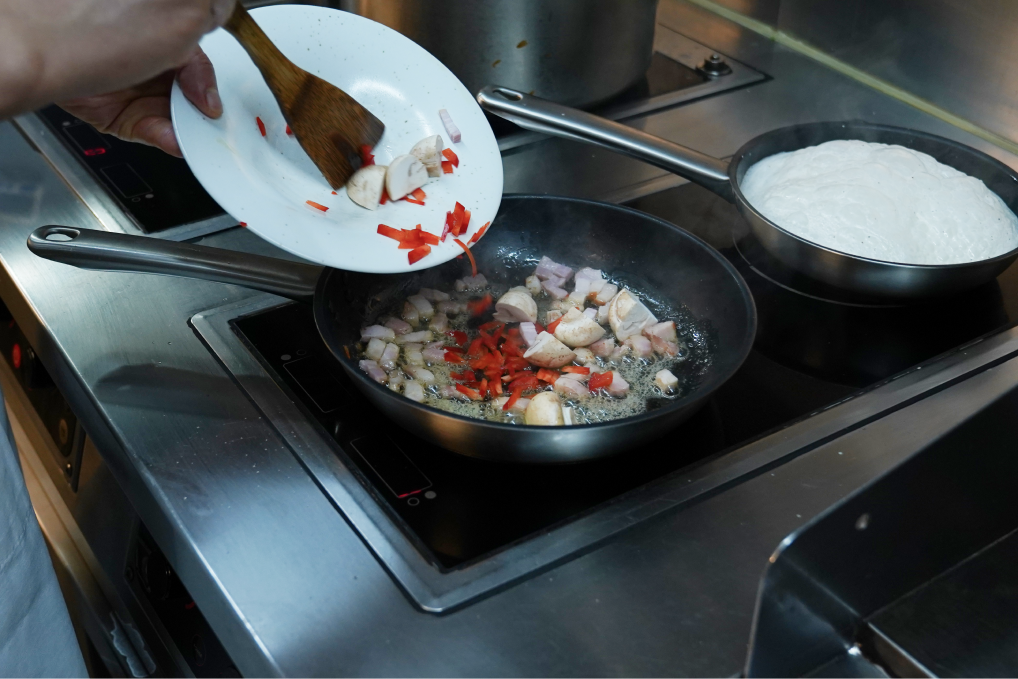 ‘01'에 파프리카 슬라이스와 반으로 자른 양송이를 넣어서 구운 빛이 날 때까지 볶은 뒤,