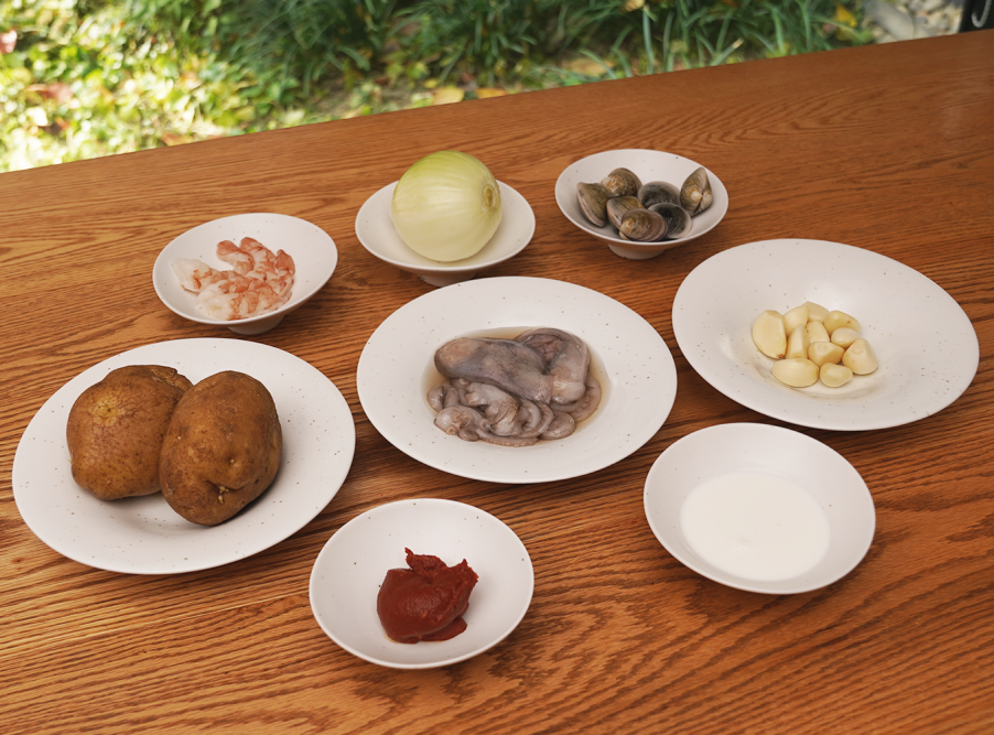 커리 파우더 1T, 감자 1개, 새우 3마리, 낙지 1마리, 양파 1/4개, 마늘 10개
