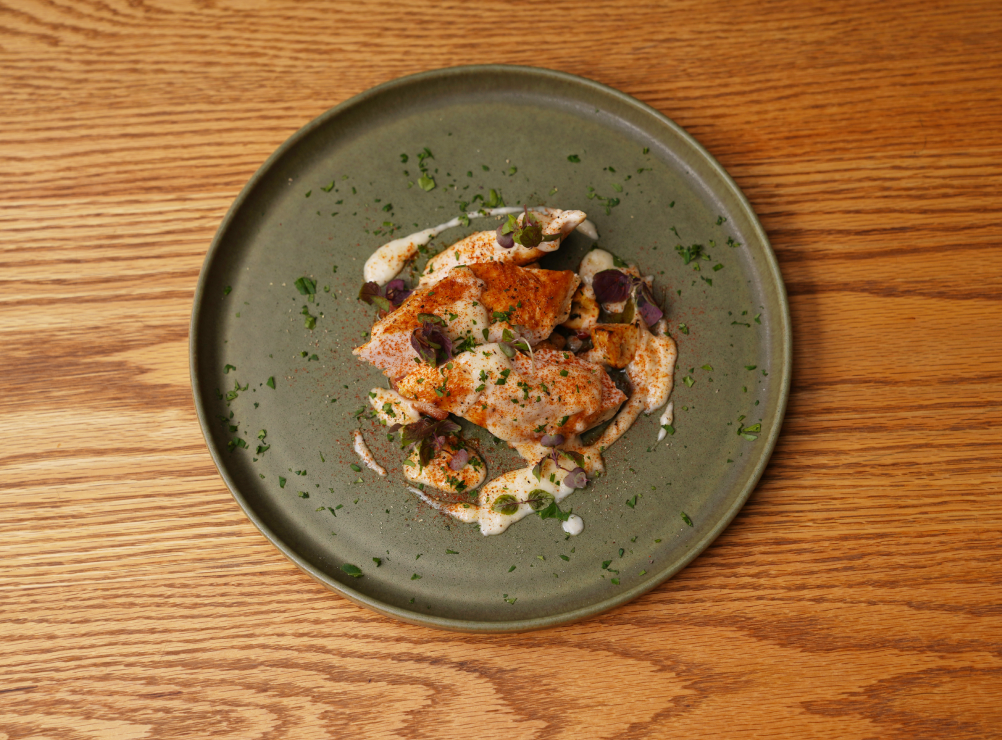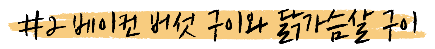 바삭해질 때까지 천천히 굽는다. 닭가슴살의 껍질 부위가 바삭해졌다면 반대로 뒤집고, 불을 중불로