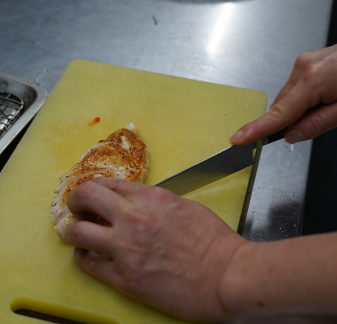 2. 닭가슴살 구이를 손가락 한마디 굵기로 자른다.