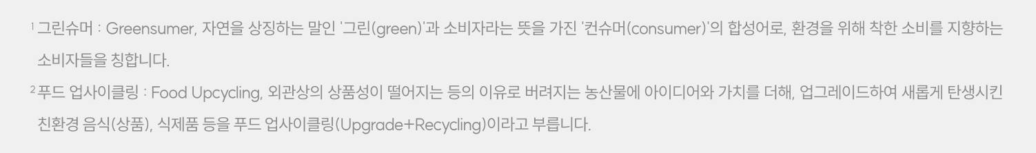이번 연말에는 푸드 업사이클링에 관심을 가져보면서 함께 그린슈머로의 한 걸음을 더 내디뎌 보시는 것은 어떠실까요?
