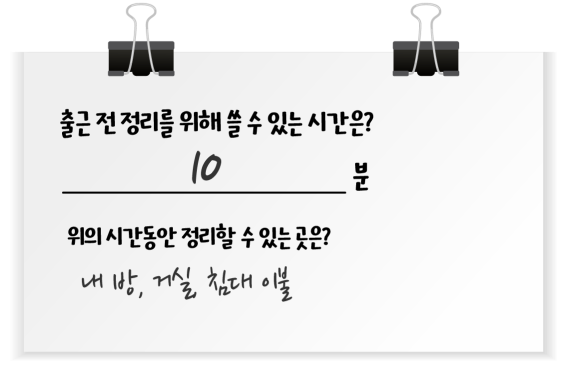 매일 10분만 일찍 일어나 방 정리를 해 보세요. 저는 출근 전 간단한 집안일을 모두 끝내두는데요. 흐트러진 물건들을 제자리에 가져다 두고, 청소기를 돌리는 정도만 하는데도 시간을 재보면 10분이 채 걸리지 않더라고요. 조금 늦게 일어나 아침 시간이 분주할 때는 거실만 청소기를 돌리기도 합니다. 이것만 해도 퇴근하고 집에 들어왔을 때 기분이 달라요. 제2의 직장으로 다시 출근하는 것이 아니라 진짜 편안히 쉴 수 있는 내 공간에 들어선 기분이 들거든요.