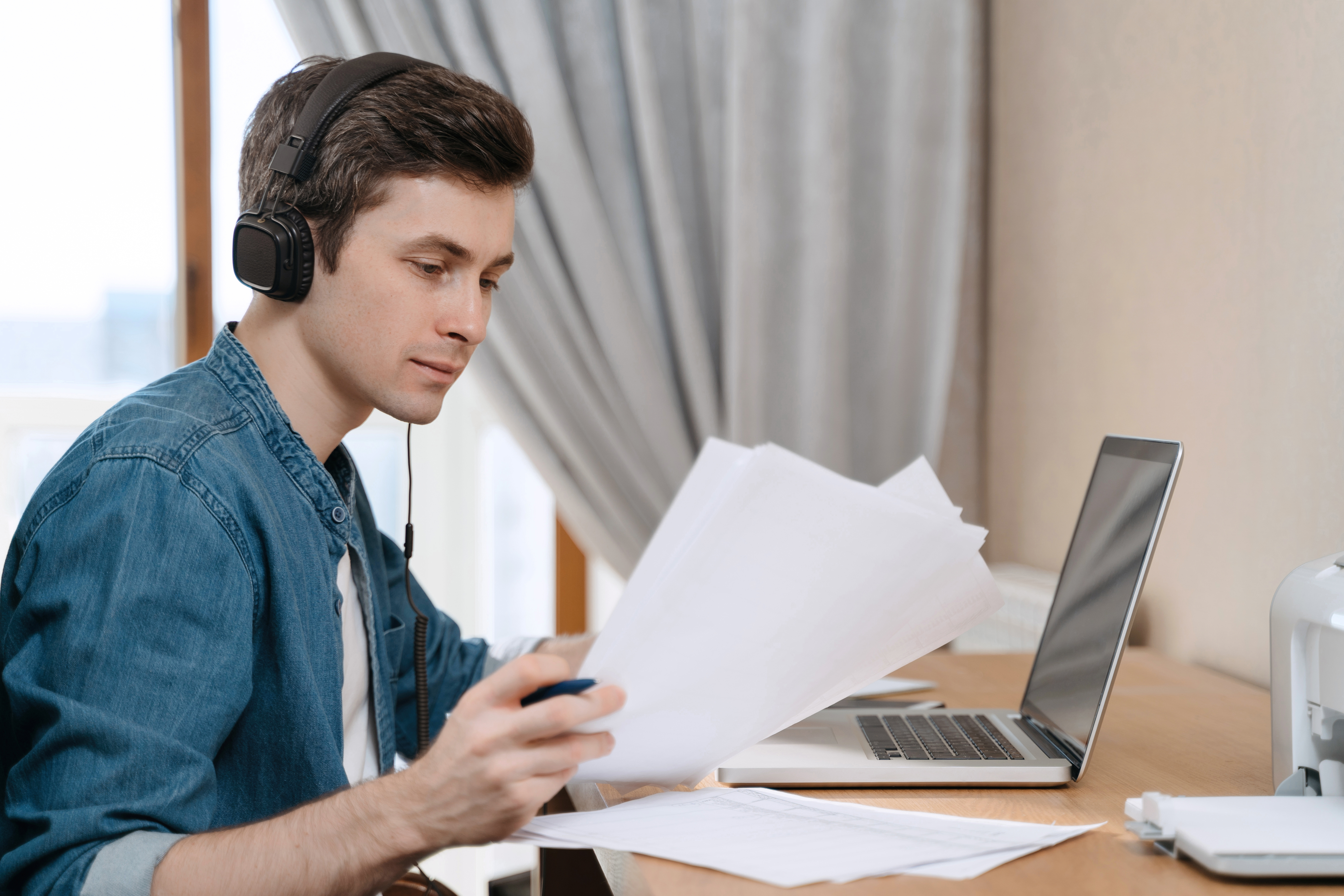 방음부스에서 나와 책상이 있는 2층으로 올라가서 일을 시작한다.