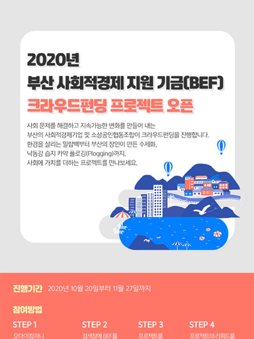 캠코 등 8개 공공기관, 사회적경제 기업 5천만원 지원 캠코 등 부산지역 8개 공공기관은 「부산 사회적경제 지원 기금(BEF)」을 통해 올해 제2차 크라우드 펀딩 프로젝트에서 목표금액을 달성한 18개 사회적경제 기업 등에 매칭투자금 5천만원을 지원했다고 12월 29일(화) 밝혔다. #BEF #사회적경제 #사회적기업지원