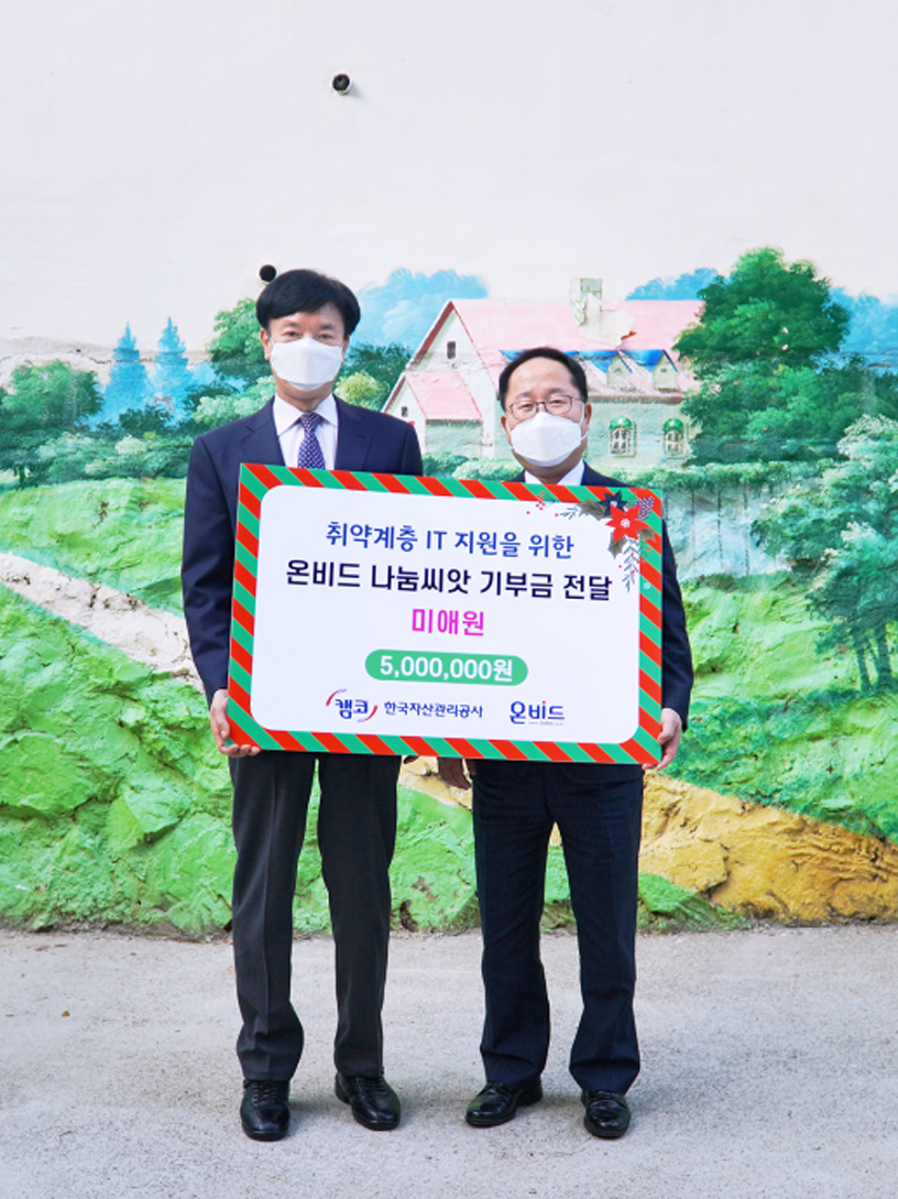 캠코 ‘온비드 나눔씨앗’ 적립금 1천만원 기부 캠코는 12월 21일(월) 아동․청소년 IT 기기 지원 등을 위해 부산 소재, 보육원 ‘미애원’과 대안학교 ‘우다다학교’에 ‘온비드 나눔씨앗’ 적립금 1천만원과 교육용 PC를 기부했다고 밝혔다. #나눔씨앗프로그램 #사회공헌 #온비드