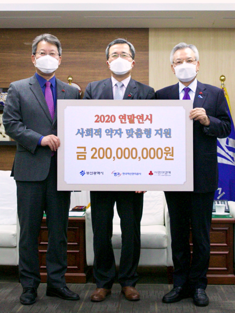캠코, 맞춤형 나눔활동 기부금 2억원 전달 캠코는 12월 21일(월) 부산광역시청에서 문성유 캠코 사장, 변성완 부산시장 권한대행, 신정택 부산사회복지공동모금회 회장 등이 참석한 가운데 부산광역시에 취약계층을 위한 맞춤형 나눔활동 기부금 2억원을 전달했다. #맞춤형지원 #캠코산타클로스 #기부