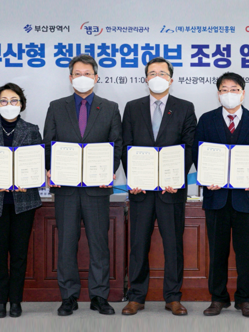 캠코, 「부산 청년창업허브」 조성 MOU 체결 캠코는 12월 21일(월) 부산광역시청에서 문성유 캠코 사장, 변성완 부산시장 권한대행, 이인숙 부산정보산업진흥원장, 강경태 부산디자인진흥원장 등이 참석한 가운데 「혁신도시 활성화를 위한 부산형 청년창업허브 조성」 업무협약을 체결했다. #청년창업허브 #MOU #부산