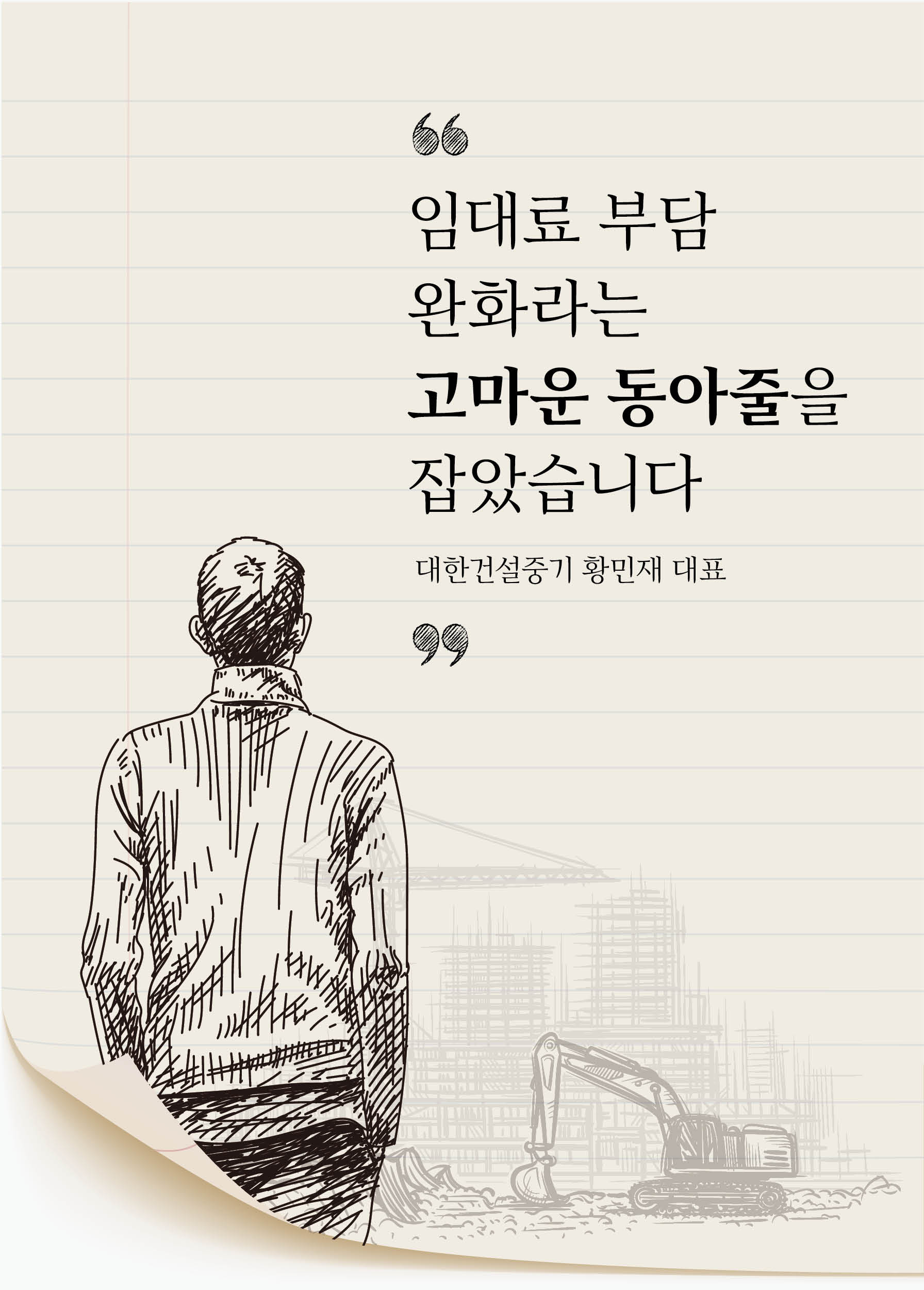 대구에서 중장비 대여업을 운영하고 있는 대한건설중기 황민재라고 합니다. 제가 사는 대구지역은 특히 코로나 사태로 인해 가장 먼저 타격을 입은 지역이었습니다. 공사가 진행 중인 곳에 기사를 연결하고 장비를 빌려주는 것이 저희의 주요 사업이었지만 코로나19 사태로 인해 대부분의 공사가 중단되는 위기를 겪었습니다. 중장비 규모가 크다 보니 이를 주차하기 위해 넓은 주차 공간이 필요해 국유재산으로 주차장 용지를 임대받아 사용하고 있었는데, 임대료를 내기조차 어려운 상황이었죠.