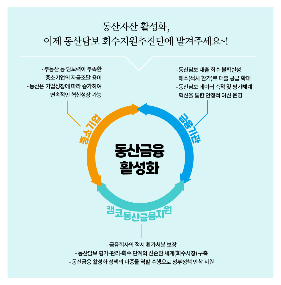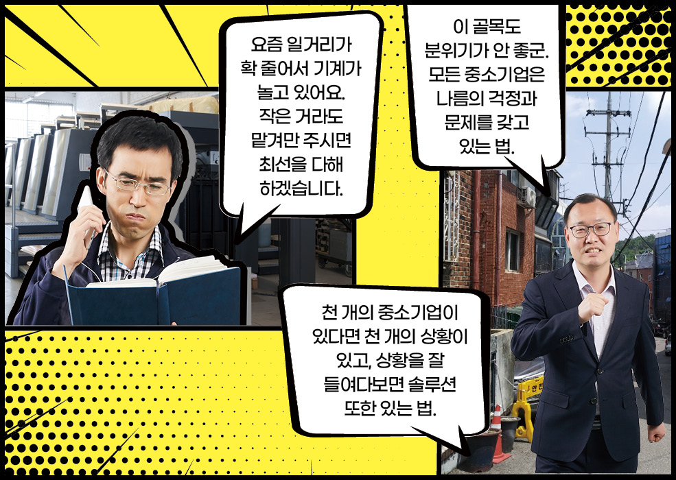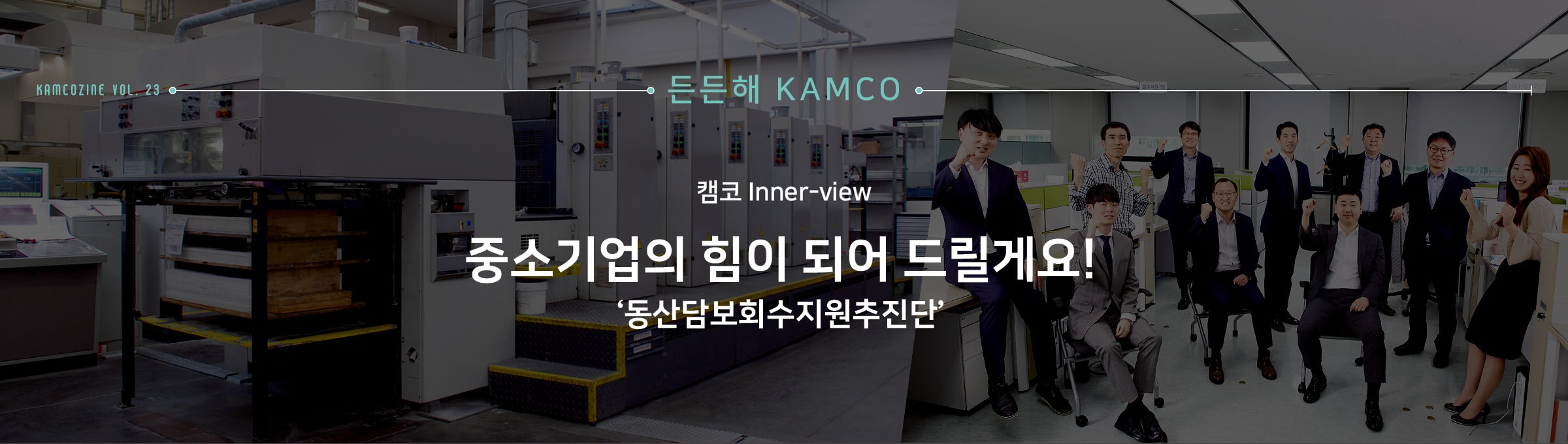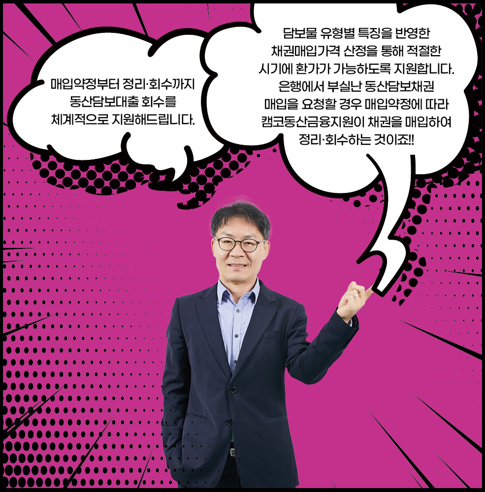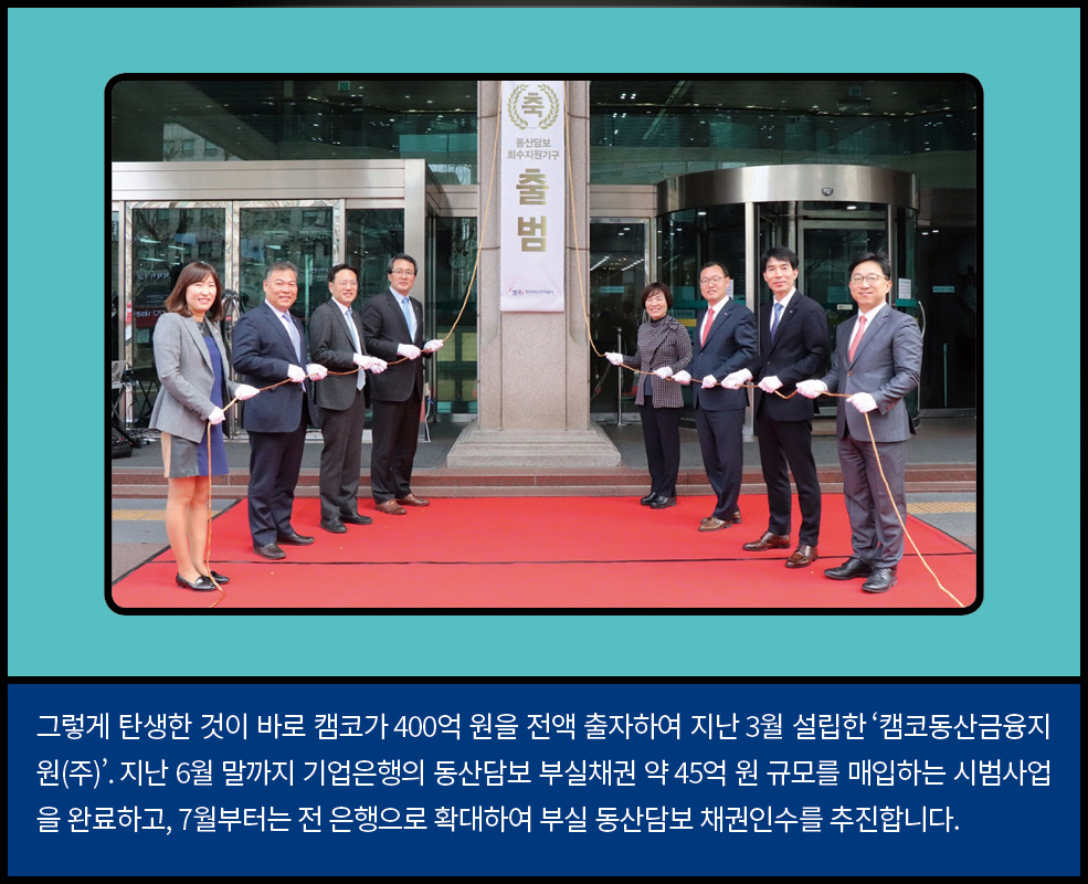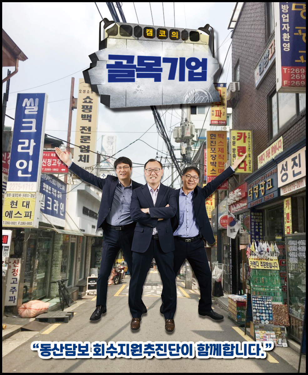 경기 침체로 어려움을 겪고 있는 캠코로 공장골목에 동산담보회수지원추진단이 찾아왔습니다. 중소기업을 살리기 위해 두 팔 걷어붙인 차단장과 막강 팀원들의 이야기가 지금 시작됩니다. 경기 침체로 어려움을 겪고 있는 캠코로 공장골목에 동산담보회수지원추진단이 찾아왔습니다. 중소기업을 살리기 위해 두 팔 걷어붙인 차단장과 막강 팀원들의 이야기가 지금 시작됩니다. BEHIND INTERVIEW 차상휘 단장모처럼 직원들과 함께 활짝 웃은 것 같습니다. 앞으로 직원들과 스스럼 없이 이야기 나누는 자리를 자주 마련해야 될 것 같아요. 다들 고생 많으셨습니다. 최종욱 팀장사진 촬영이 익숙하지 않아 조금 어색해했지만 반복되는 회사생활 속에 새로운 경험이라 즐거웠습니다. 동산담보 회수지원기구를 설립하면서 새로운 것들을 많이 배웠고, 이 회사가 앞으로도 안정적으로 운영되어 좋은 성과가 날수 있도록 노력하겠습니다. 이해진 팀장동산담보 회수지원 업무가 잘 홍보된 것 같아 매우 뿌듯합니다. 지금까지 모두 고생한 만큼 앞으로 알찬 결실을 맺었으면 합니다. 김인선 차장이제 얼굴이 알려졌으니 기계 홍보는 잘 되겠죠? 기계 이름만 들어도 용도와 가격을 알 수 있을 것 같은데요, 현금처럼 융통되는 기계 거래가 되도록 더욱 열심히 일하겠습니다. 이성엽 과장캠코에서 새롭게 시작하는 사업인 만큼 기틀을 잘 마련해 향후 캠코의 발전에 큰 기여를 할 수 있도록 노력하겠습니다. 오늘 화기애애한 시간을 통해 다시 한번 의지를 다지게 됩니다. 정민영 과장저는 캠코동산금융지원(주)를 운영하는 업무를 맡고 있는데요, 일전에 단장님께서 제 일을 비닐하우스로 비유하신 적이 있습니다. 사업이 좋은 열매를 맺을 수 있도록 알맞은 환경을 제공하는 일이 제 역할이라 생각하고, 잘 가꾸어나가겠습니다. 임경철 과장동산담보부 채권인수 업무를 맡고 있는데요, 과거 사례가 많은 부동산담보부 채권인수와 달리 인수금액 산정에서 매입 프로세스까지 다른 부분이 많습니다. 더욱 열심히 공부하겠습니다. 이가현 대리동산담보 회수지원추진단이 하는 일을 많은 사람들이 이해하기 쉽고 재미있게 설명하는 자리가 되었던 것 같습니다. 동산담보대출 시장 활성화에 기여하고 있다는 자부심을 잊지 않겠습니다. 위준 대리 동산담보채권의 인수와 정리 업무를 맡고 있습니다. 앞으로 시범 사업을 넘어 지속적으로 동산담보대출이 확대될 수 있도록 제 역할을 다하겠습니다. 안계진 대리캠코의 신사업을 알릴 수 있는 뜻깊은 시간이었습니다. 오늘을 계기로 다시 한번 각오를 다지며 동산금융시장 홍보 및 활성화에 최선을 다하겠습니다. 코스모스팜 소셜댓글