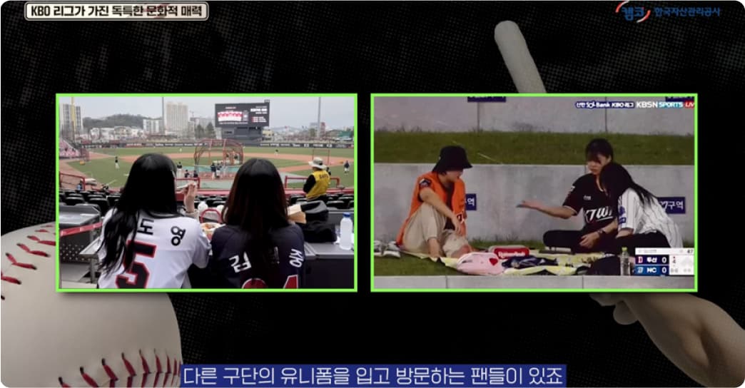 메이저리그나 일본 야구와 비교하면 야구장 분위기가 조금 더 활기차고 자유로운 면이 있습니다. 아무래도 최근에 야구장을 찾아오는 팬들의 연령층이 젊어지면서 야구 경기를 즐기는 방법도 자유로워졌다고 할 수 있습니다. 예를 들면 홈팀과 원정팀의 팬들이 동행해서 나란히 경기를 본다거나 아니면 경기와는 무관한 다른 구단의 유니폼을 입고 방문하는 팬들이 있죠. 미국이나 일본에서는 확실히 보기 드문 장면입니다.
